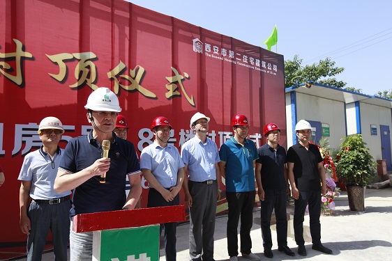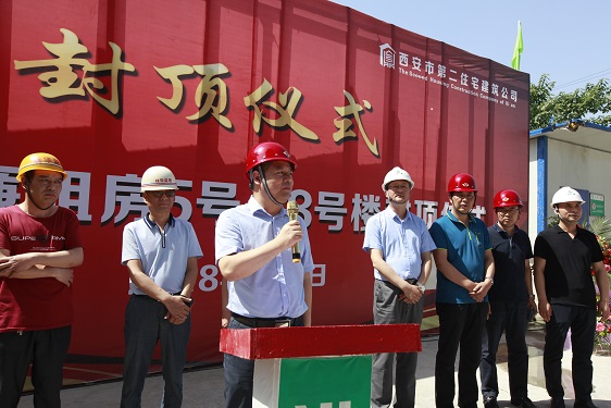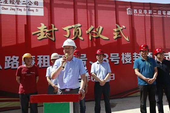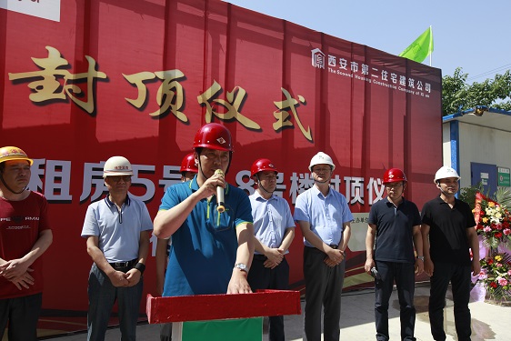 在封頂儀式上,經營二公司經理董文軍對參與該項目的施工方、監理方和勞務方的工作表示了衷心的感謝;林華監理代表對5#、8#樓的施工質量、進度、安全等方面予以充分的肯定,并對5#、8#樓春節前搶抓進度,創造月進度5層半的成績表示贊嘆;市局領導強調丈八路廉租房項目在后期建設中,要繼續發揮5#、8#樓作風過硬、技術過硬的優勢,在保證安全和質量的前提下搶進度,保質量。房管處劉振龍處長特別提出兩個具體要求:一是安全生產的重要性,要時刻保持警惕,一刻不得松懈;二是要注意治污減霾和施工噪音擾民的問題,要注意防塵覆蓋和定時噴淋,高考中考時間停止夜間施工,為保衛西安藍天做貢獻,為廣大學子營造良好學習休息環境。